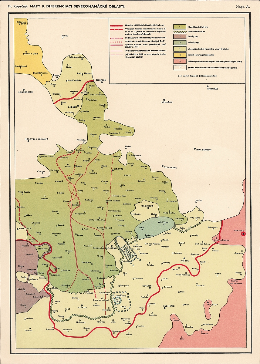 KOPEČNÝ, F. (1958). Mapy k diferenciaci severohanácké oblasti. In: MACHEK, V. (ed.). Studie ze slovanské jazykovědy. Sborník k 70. narozeninám akademika Františka Trávníčka. Praha: Státní pedagogické nakladatelství, s. 383–386.